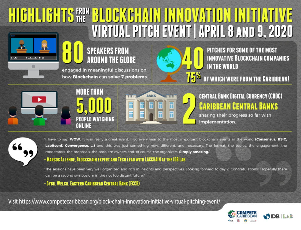 Compete Caribbean’s Blockchain Innovation Initiative (BII) – The Virtual Pitch Event of April 8th and 9th was the first of its kind in the Caribbean, involving 80 world-class experts and +6, 000 people watching online via Facebook Live. With most of the region under lockdown and curfew, Compete Caribbean sought to e-connect the Global Blockchain