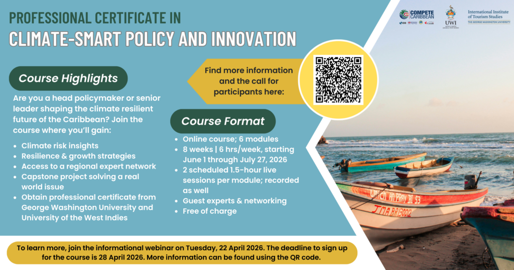 The Professional Certificate in Climate-Smart Policy and Innovation for Caribbean Development is offered by Compete Caribbean+ in partnership with The University of the West Indies (UWI)-Mona Campus, Climate Studies Group Mona and The George Washington University International Institute of Tourism Studies. |